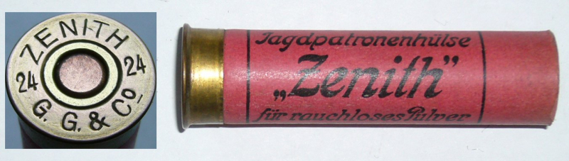 Angeboten wird 1 leere, ungebrauchte Schrothülsen Kal. 24 in neuwertigem Zustand, Marke ZENITH, hergestellt in den 1930er Jahren von Genschow.