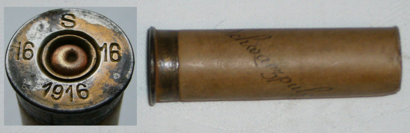 Angeboten wird 1 leere, ungebrauchte Schrothülse Kal. 16, mit Eisen-Bodenkappe von 1916 als für Jäger kein Kupfer mehr vorhanden war. Seitenaufschrift: Schwarzpulver. Eine Fertigung der Patronenhülsenfabrik Bischweiler/Elsass -Walbinger&Meuschel- . Die Hülse lagerte auf dem offenen Dachboden der Büchsenmacherei ERDELT in Neustadt/Haardt (Weinstraße). 100 Jahre Schmutz habe ihre Spuren hinterlassen die nicht mehr ganz zu entfernen sind.