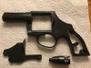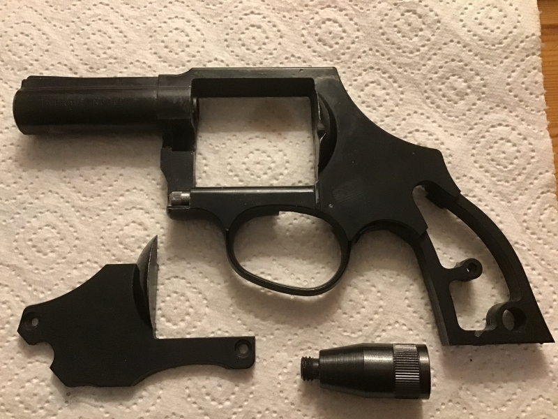 Rarität: Geco Modell 390 G, Kal. 9 mm Knall, nur der Rahmen (leer) und die Deckplatte. Laufsperre und Gewinde ok, Brünnierung altersentsprechend in gutem Zustand, leichte Schmauchspuren an der Laufwurzel.Ein passender Abschußbecher liegt auch bei, ob er original ist, kann ich nicht sagen. Beschuß JA. Kein weiteres Zubehör.