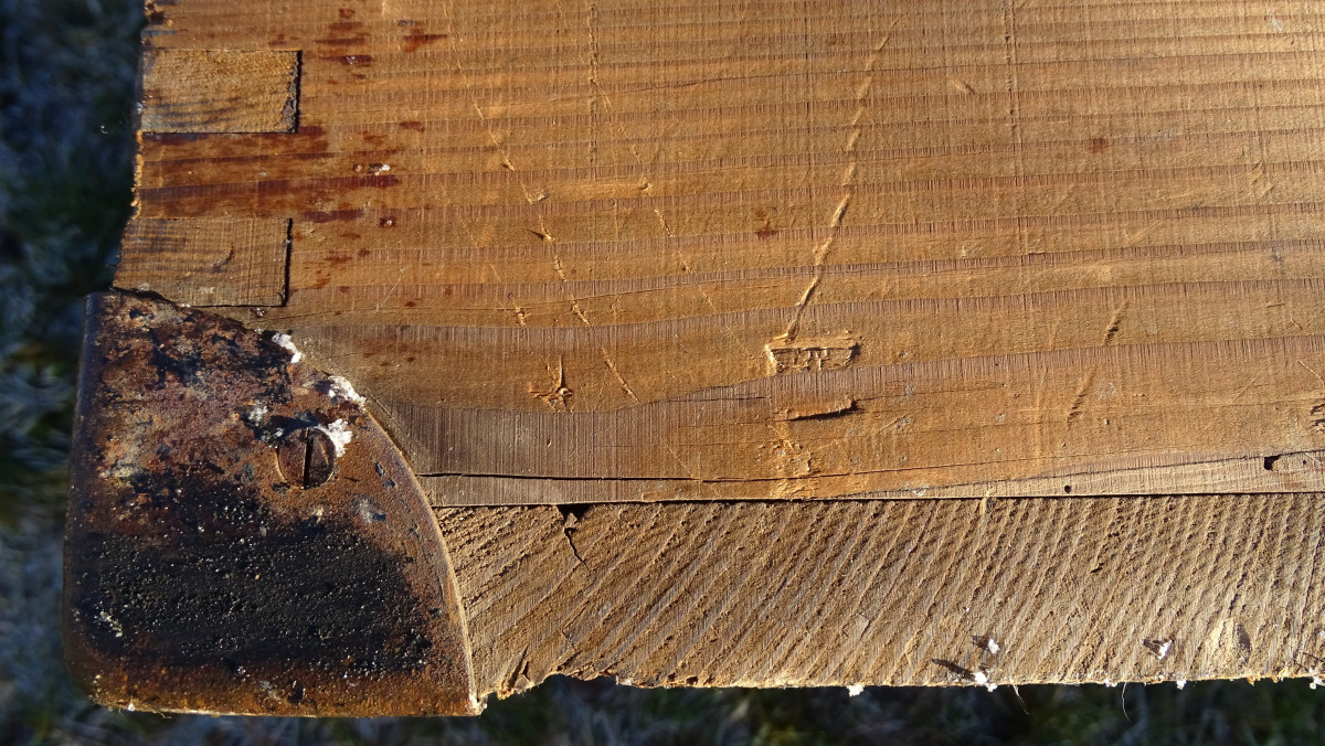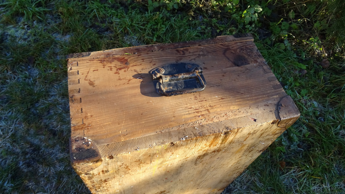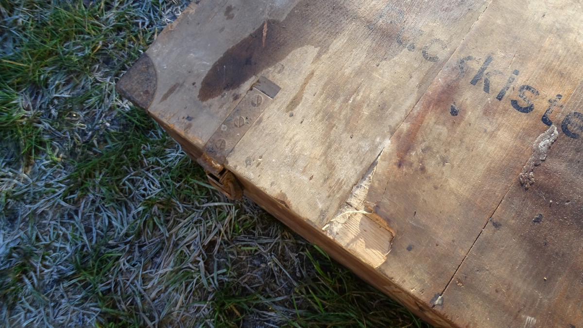 Der Deckel der Kiste hat leider Schaden durch Regenwasser genommen !