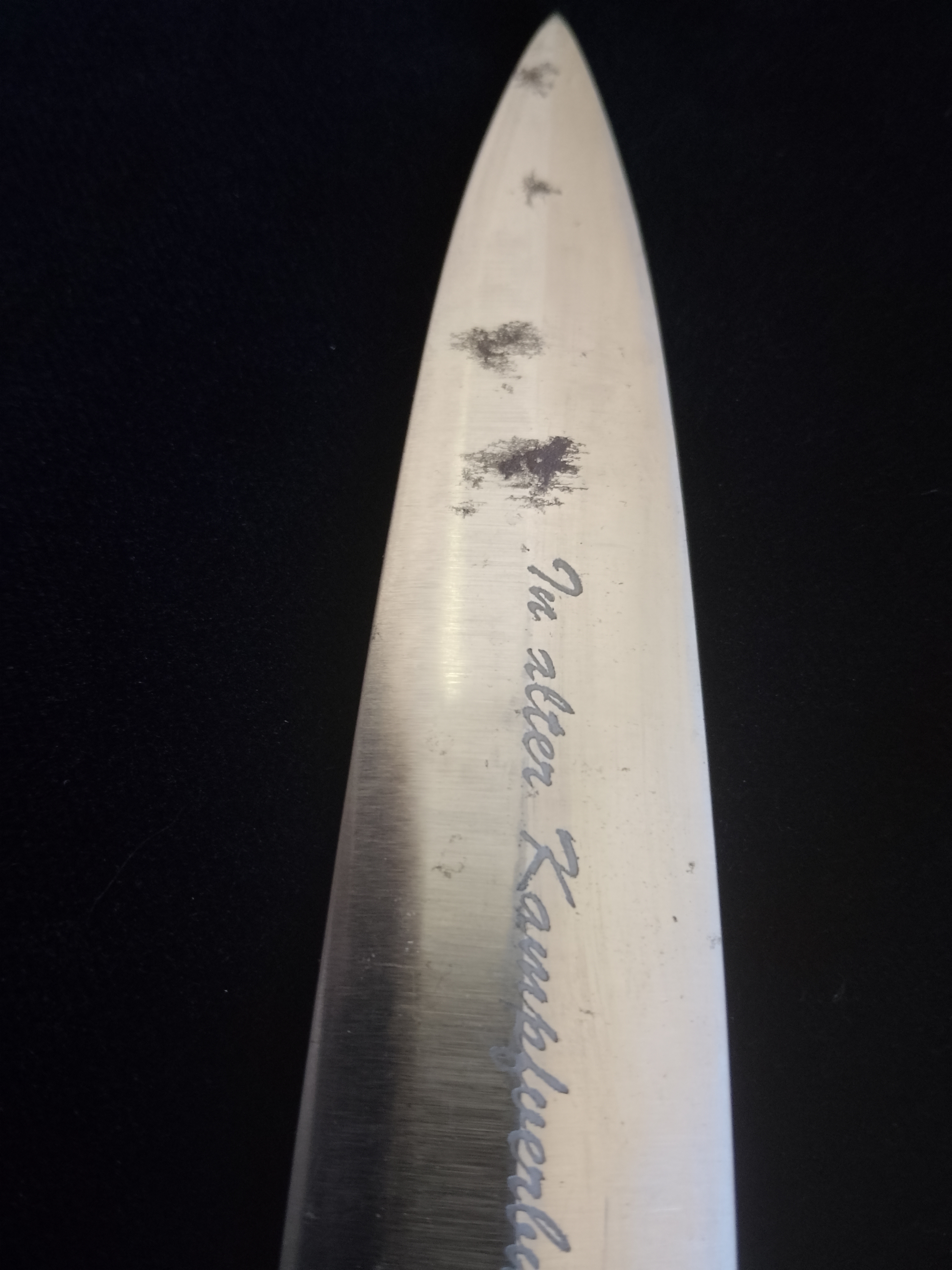 Vorderseitige Devise der XX, rückseitig eine Widmung eines Sturmbahnführers, Hersteller Klinge eindeutig im Gesenk geschmiedet, blau gepliestet so wie es sein sollte, geätzt, keine Laserung, meiner Meinung nach, altes Stück,Herstellung vor 1945 kann nicht garantiert werden, aber mit Sicherheit keine neuzeitlich Anfertigung, Klinge war noch nie verbaut bitte Bilder beachten, ohne Obligo