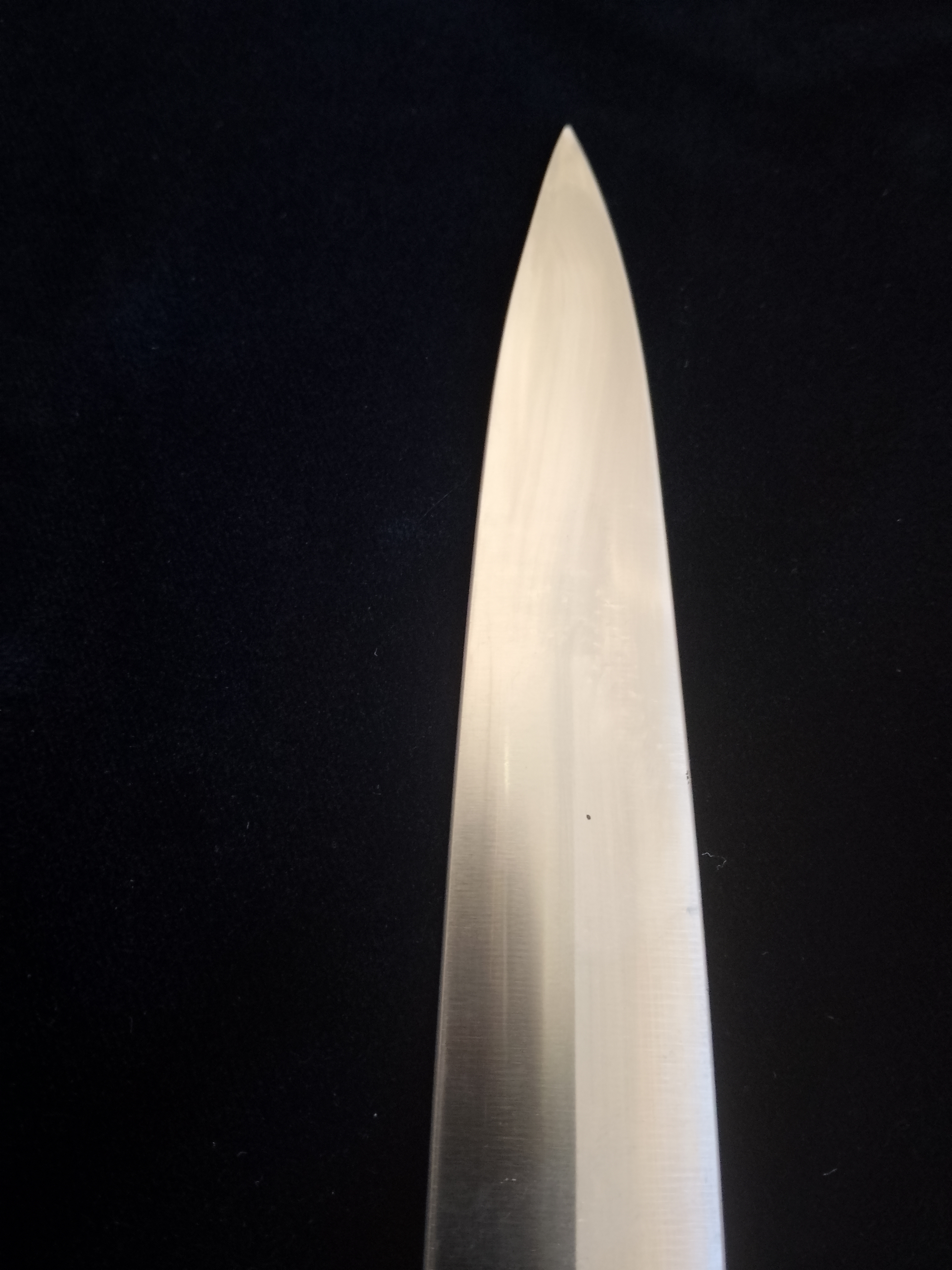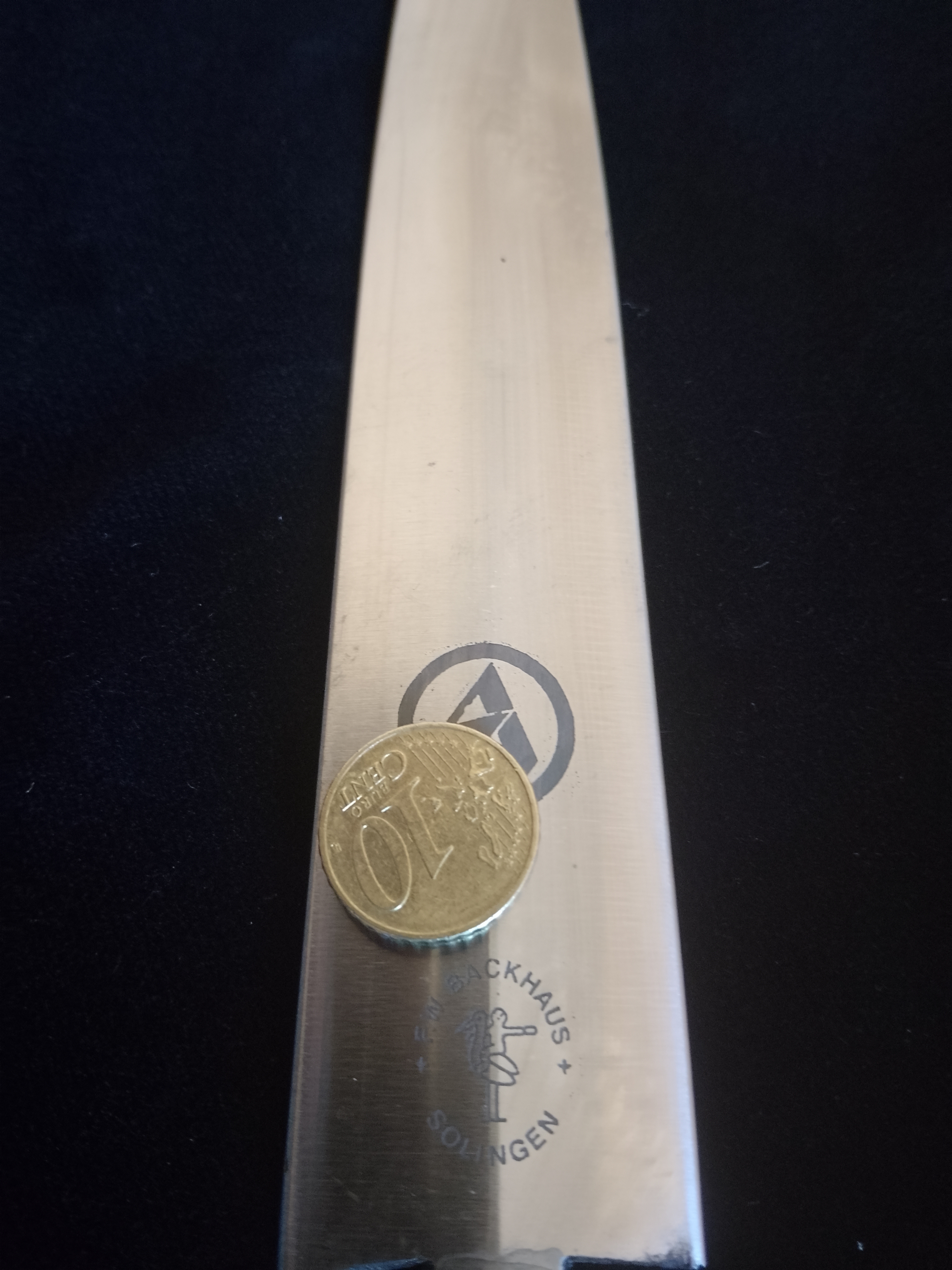 Klinge eindeutig im Gesenk geschmiedet, Klinge blau gebliestet so wie es sein sollte, Klinge doppelseitig geätzt, nicht gelasert.