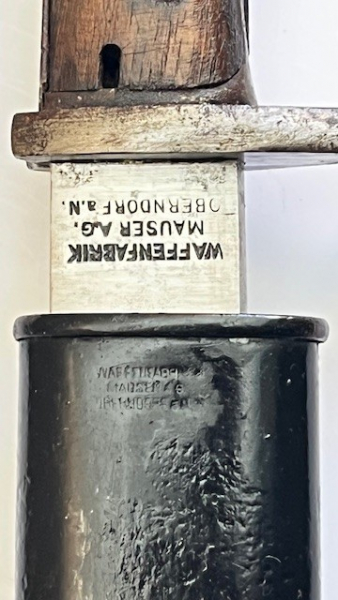 Es handelt sich um ein deutsches Bajonett 98/05 aus dem Jahre 1918, wegen seiner Form auch Butcher-Bajonett genannt. Die Klinge ist blank und ist übereinstimmend mit der Scheide mit dem Herstellernamen "Waffenfabrik Mauser A.G. Oberndorf a.N." markiert. Die Bajonettscheide ist schwarz überlackiert. Die Holzgriffe sind mit zwei Schrauben befestigt und fixieren so das Feuerschutzblech. Die Klinge ist feldmäßig leicht geschärft, der Haltestift ist gängig, Rostspuren sind aufgrund der Lagerung vorhanden._____Der Koppelschuh ist rückseitig markiert, das Loch für den Haltehaken der Scheide ist gerissen._____Die Ware wird unter Ausschluss jeglicher Gewährleistung wie beschrieben und abgebildet verkauft. Ich weiße darauf hin, dass es sich um einen sehr alten Gegenstand mit entsprechenden Gebrauchsspuren handelt._____Ob sich der Artikel im Originalzustand befindet (oder während bzw. nach einem etwaigen Kriegseinsatz überarbeitet wurde) ist mir nicht bekannt und kann daher nicht zugesichert werden. Ich sende gerne auf Anfrage weitere Bilder!_____________________