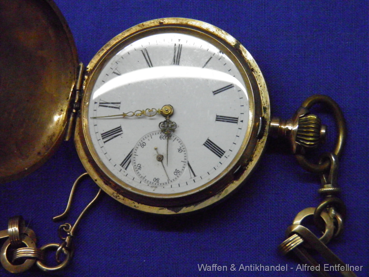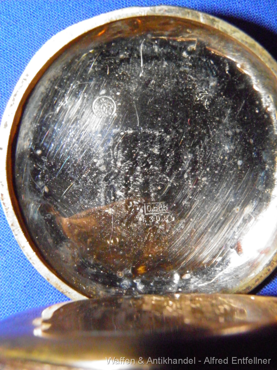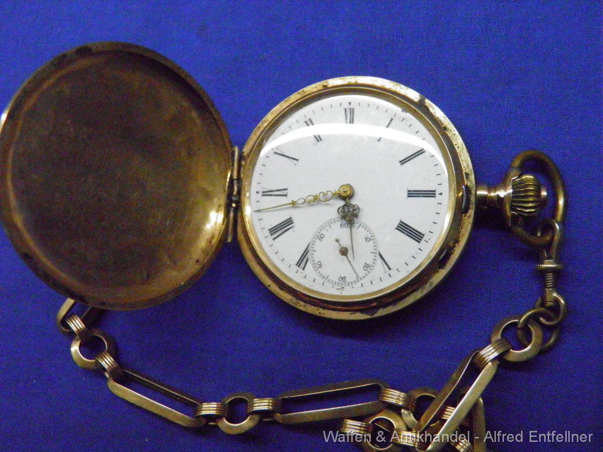 Herren Taschenuhr Gold 0,585 Stempelmarke auch Kronenmarke. Guter Zustand schon Tragespuren. Werk tickt und läuft, auf Gangenauigkeit Nicht geprüft.