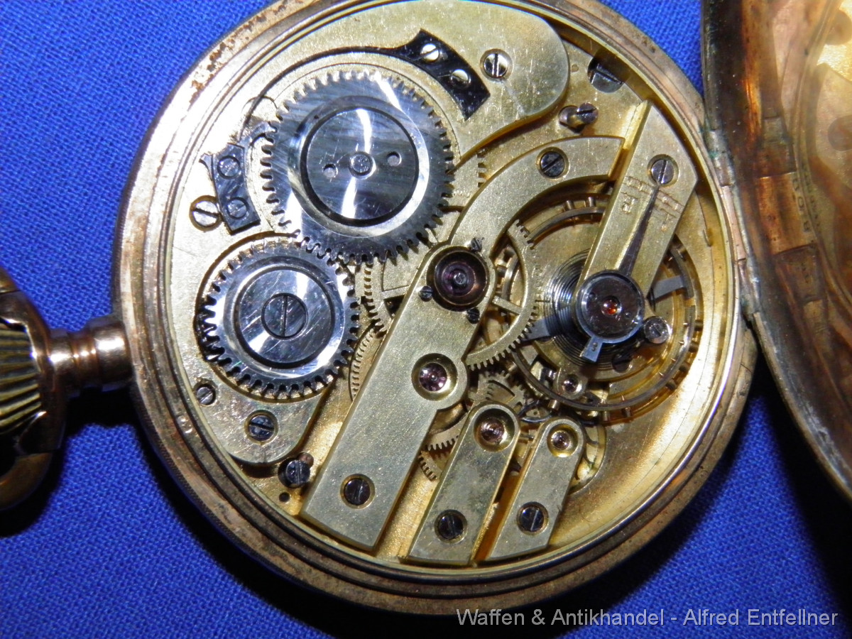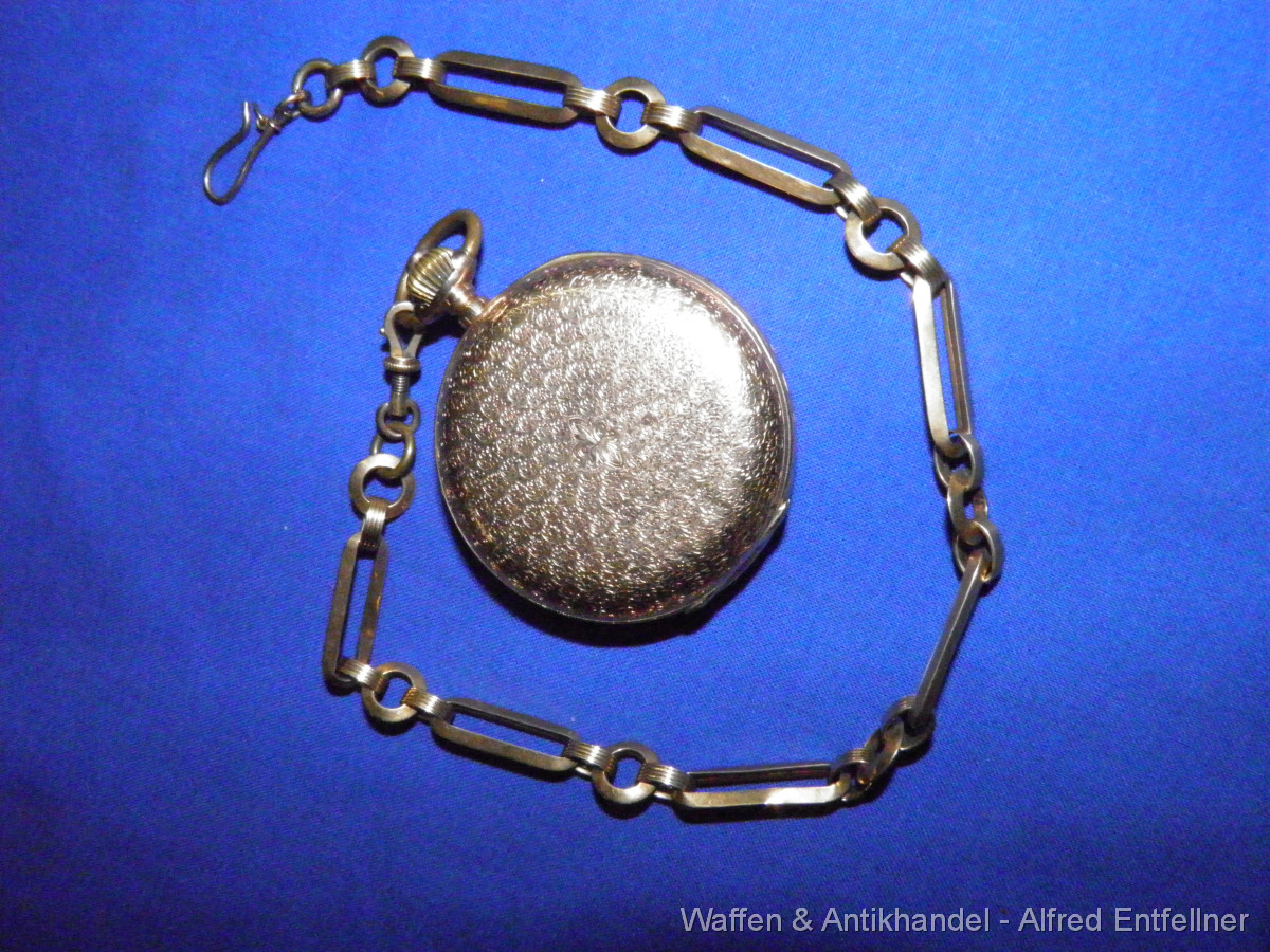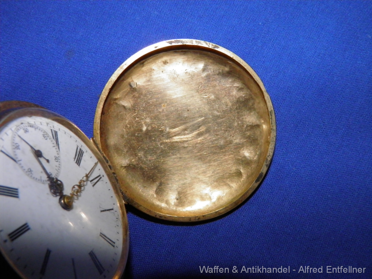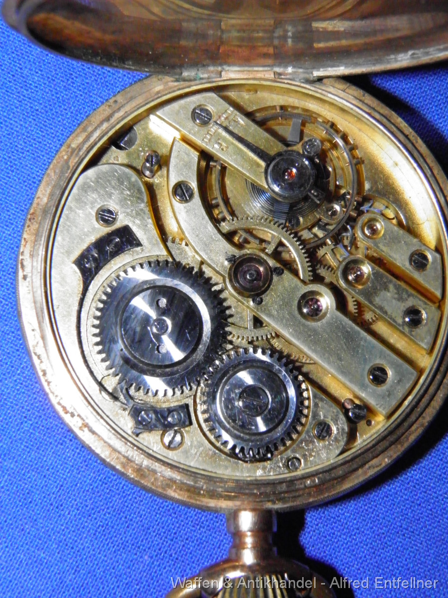 Herren Taschenuhr Gold 0,585 Stempelmarke auch Kronenmarke. Guter Zustand schon Tragespuren. Werk tickt und läuft, auf Gangenauigkeit Nicht geprüft.