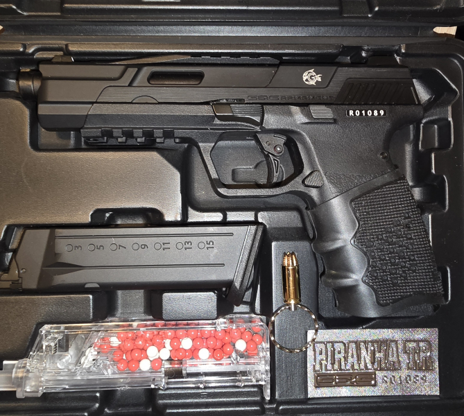 Hallo, biete hier eine G&G Piranha tr in schwarz, 6mmBB, Gas an. Die waffe hat Blowback, hat keine gebrauchspuren, waffe ist aus Polymer. Mit dabei ein Waffenkoffer, speedloader.