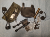 Zum Verkauf stehen ein Zweibein, Putzzeug, ein massiver Messinggriff und diverse unbekannte Teile im abgebildeten Zustand
