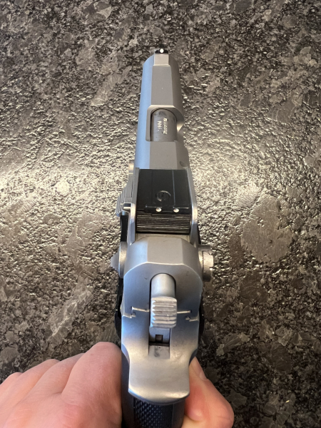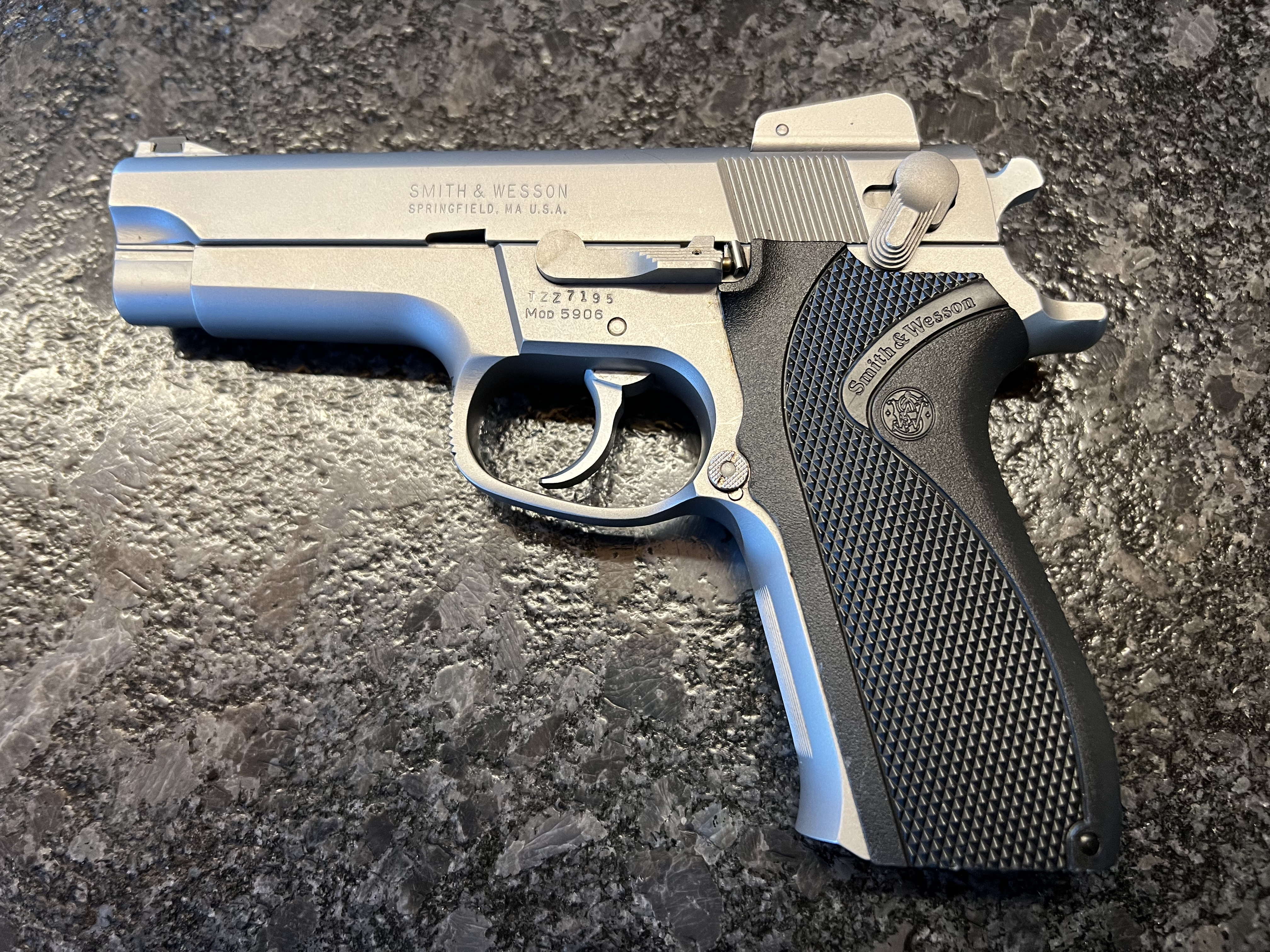 Zum Verkauf steht eine hochwertige halbautomatische Pistole Smith & Wesson Modell 5906 im Kaliber 9 mm Parabellum. Dieses bewährte Ganzstahlmodell aus der renommierten US-amerikanischen Waffenschmiede überzeugt durch Zuverlässigkeit, Präzision und zeitloses Design.