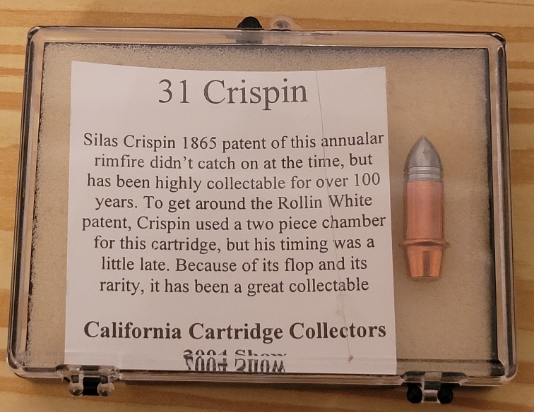 "Silas Crispin 1865 patent of this annualar rimfire didn't catch on at the time, but has been highly collectable for over 100 years. To get around the Rollin White patent, Crispin used a two piece chamber for this cartridge, but his timing was a little late. Because of its flop and its rarity, it has been a great collectable."