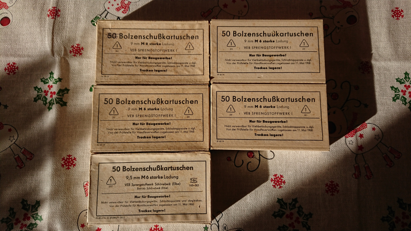 Sie bieten hier auf 250 Stück M6 (starke Ladung) Bolzenschusskartuschen vom VEB Sprengstoffwerk Schönebeck. Sie wurden verwendet für den DDR Dübelsetzer/Bolzenschussgerät aus Suhl. War jahrelang trocken gelagert und funktioniert! Die Kartuschen sollten in jeden Schreckschussrevolver passen, da sie maßlich identisch der normalen 9mm R Knall sind. Ich habe 2 Stück davon Probe geschossen und konnte keine Probleme feststellen. Der Knall ist vergleichbar mit normaler 9mm R Knall Munition.