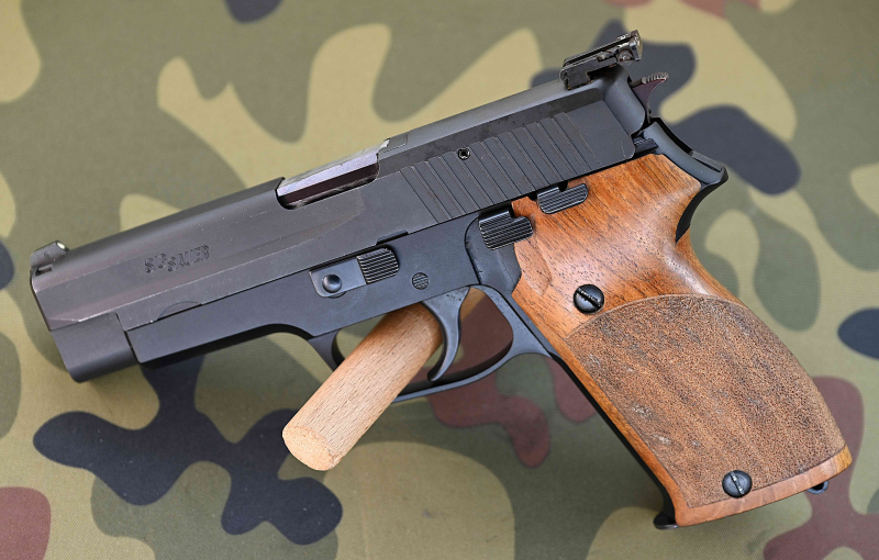 Vom Vorbesitzer wurden formschöne wie griffige Holzgriffschalen und eine höhen- und seitenverstellbare LPA Sportvisierung verbaut.