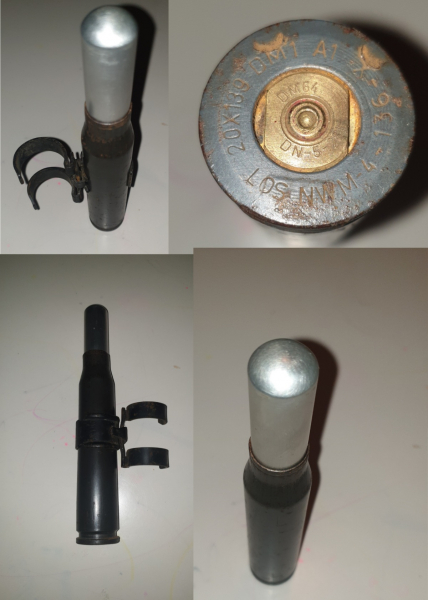 Hallo, ich biete hier eine inerte Hülse mit Kettenglied für die Rheinmetall 202 mit einem Dummy Projektil aus Alu.