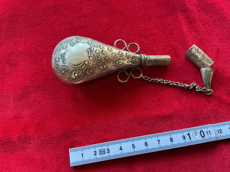 Keine Ahnung, woher das kommt und wie alt das ist. Der Korpus ist aus Silber oder Neusilber, keine Punzen erkennbar. Gesamtlänge ca.10cm. Der Stopfen dürfte auf die Tülle drauf gehen, aber da fehlt irgendeine Art von Dichtung und er ist leider verbogen und gebrochen (einpassen, löten???)….Nun ja, Restaurationsobjekt!! Vielleicht kann‘s ja jemand brauchen….Siehe Bilder!! bei Fragen, Fragen!!!