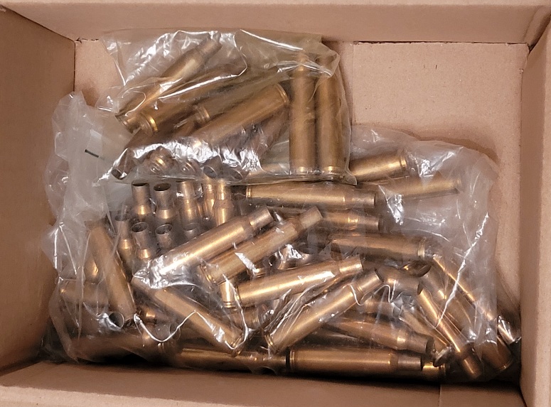 Messinghülsen mit Boxerzündung. Die Hülsen habe ich beim Kauf eines Gewehrs erhalten, kann also wenig dazu sagen.