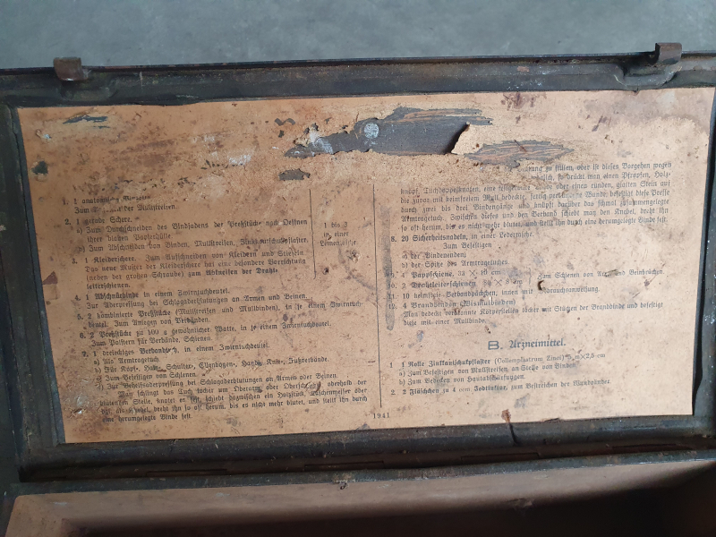 Verbandskasten der Wehrmacht für VW-Kübelwagen und andere im ungereinigten Fundzustand. Der Zustand ist den Bildern zu entnehmen! Verkauf ohne Garantie und Gewährleistung!