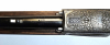 Flächendeckende englische Arabeskengravur mit großen Bögen auf silbergrauem Stahlkasten und Seitenplatten.