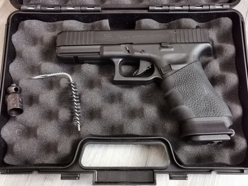 Der Hogue Combatgriff macht die Waffe um einiges ergonomischer und sie liegt besser in der Hand. Bei dem Magwell bzw. externen Bauteil, welcher als erweiterter Magazinschacht fungiert, handelt es sich um ein original Tuningteil der Marke Glock speziell produziert für die Glock 17 Gen. 5.