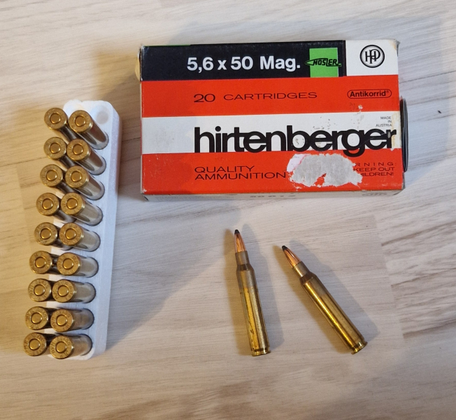 Verkaufe 20 Stück, also eine volle Packung 5,6x50 Magnum 3,6g Teilmantel Nosler von Hirtenberger Fabrikmunition. Patronen sind trocken gelagert und wie neu. Da Privatkauf keine Garantie und Rücknahme. Nachweis einer Erwerbsberechtigung. Kein Versand ins Ausland.