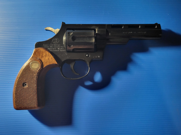 Sie bieten auf einen Mauer Revolver Modell L 100, Cal. 9mm Knall, PTB 326, Caliber 9mm, Lauflänge 4 Zoll, Trommelkapazität 6 Schuß,