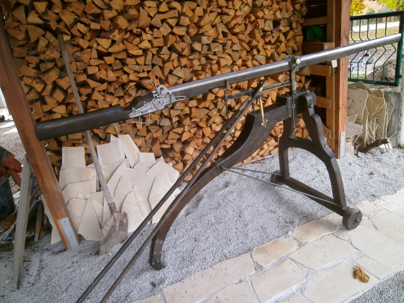 Biete euch einen Nachbau eines Doppelhaken mit Lafette an,Suhl um1630.Lafette und Schaft aus Buche gebeizt.Länge Doppelhaken 228 cm Lauf 175 cm Kal 26mm Lauf glatt mit scharfen Beschuss 40g Pulver 160g vorlage.Schloss mit Sicherung gefederten Pfannenschieber Rad oder Luntenzündung Ladestab mit Pulverschütte Radschlossschlüssel mit Zündkrautspender und Beschussbescheinigung .Kein Versand nur abholung oder kann auch gelifert werden 0,60 Cet pro km berechnet nur eine Tour.Gruß mimono
