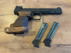 Sportpistole / Matchwaffe, Hämmerli 208S Kal. .22LR LL 150mm TL 250mm brünierte Ganzstahlwaffe mit SA-Abzug, Triggerstop, Mikrometervisier, Blockkorn Punzierte Nussholzgriffschalen mit seitlicher Handauflage (höhenverstellbar) mit Reservemagazin