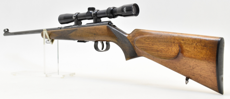 Handliche KK-Büchse mit einem 5-Schuss Magazin und Direktabzug. Der Lauf ist blank. Die Brünierung stellenweise berieben, Schaftholz mit deutliche Gebrauchsspuren. Montiert ist die Waffe mit einemTasco ZF 3-9x32 Abs.1.