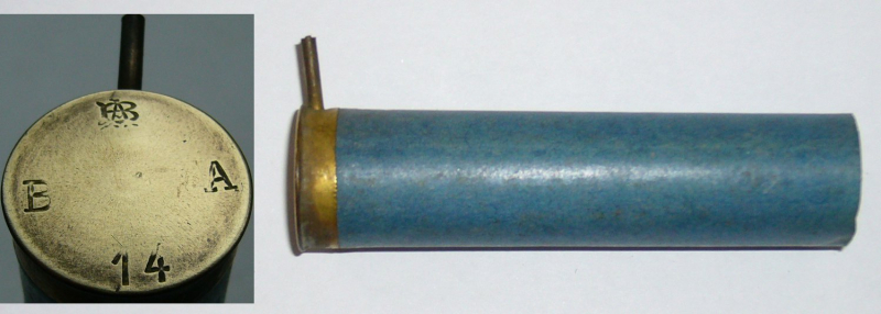 Angeboten wird 1 leere, ungebrauchte Lefaucheux-Schrothülse Kal. 14, blaue 3-Zoll-Hülse, Etabl. Barniere, B.Albert