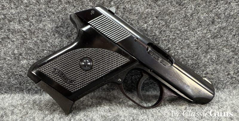 Bewährte und annähernd neuwertig erhaltene 6,35er Taschenpistole, in unserer Büchsenmacherwerkstatt fachmännisch gereinigt und verantwortungsbewusst geprüft.