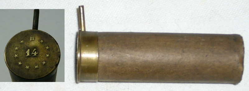 Angeboten wird 1 leere, ungebrauchte Lefaucheux-Schrothülse Kal. 14. Eine frühe Fertigung von Louis Bachmann in Brüssel, B 14 10 Sterne erhaben gestempelt. Diese Hülse lagerte auf dem offenen Dachboden der Büchsenmacherei ERDELT in Neustadt/Haardt (Weinstraße). 100 Jahre haben eine Menge Schmutz hinterlassen, der noch nicht ganz entfernt ist.