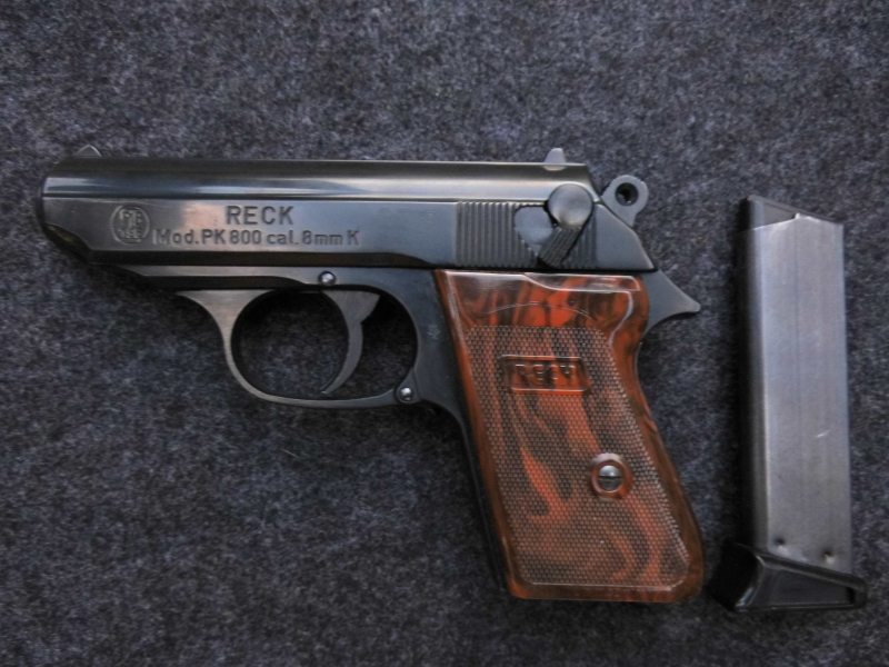 Reck PK800 8mm K ,alte PTB 196 aus 1985 . Vermutlich 3 Kronen Punziert ,2 sind nur sichtbar , ohne Patronenlager Schwächung , sehr selten im Top Zustand für das Alter. Ohne Zubehör nur die Waffe - Magazin. Geringe Laufsperre , Optisch scharfe Mündung.