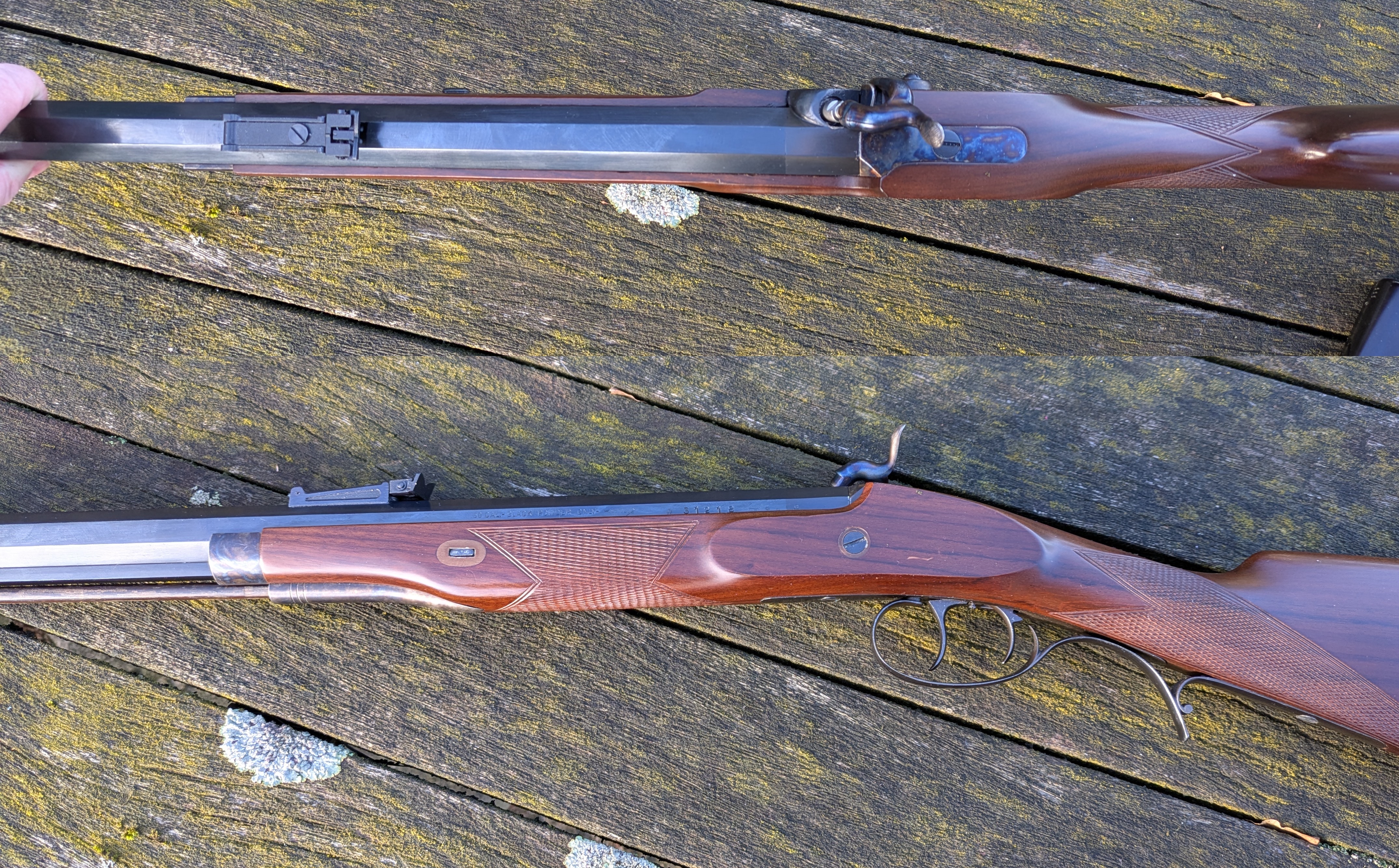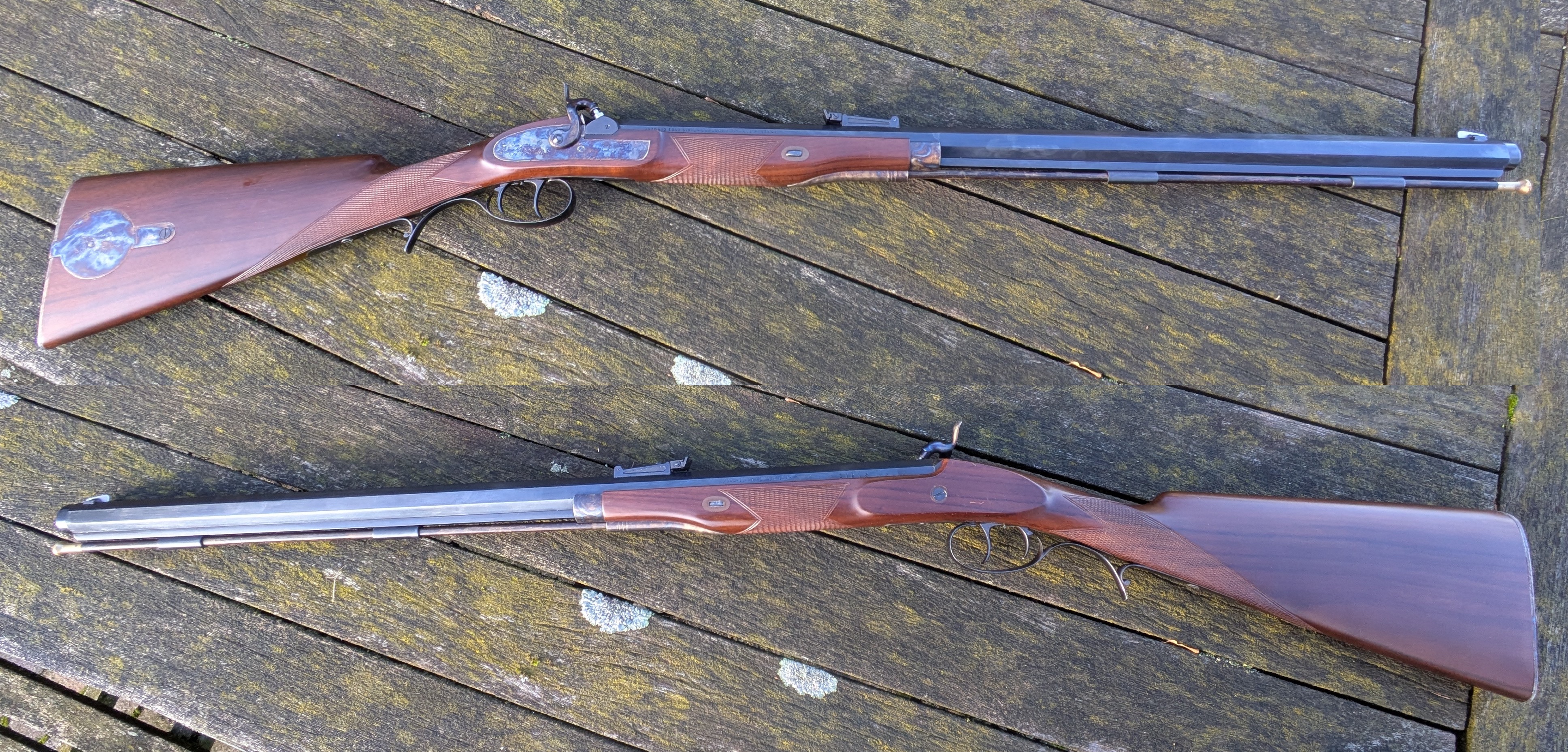 Vorderlader im Kaliber .50“ Perkussion, Lauflänge 69 cm, 6 Züge, Drall 1:48“, Pistongewinde M8x1,25, Patentschwanzschraube. Gesamtlänge 110 cm, Gewicht 3,8 kg, Nussbaum-Schaft mit Fischhaut, deutscher Stecher, Werknummer 31218.