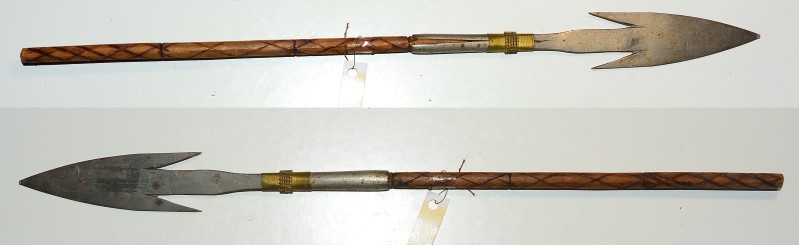 Ich denke, es handelt sich um einen Fischspeer, eventuell auch um einen hinten gekürzten Pfeil, 22cm lange Spitze mit Tülle, an der Spitze große Widerhaken, Gesamtlänge 45 cm, guter Zustand
