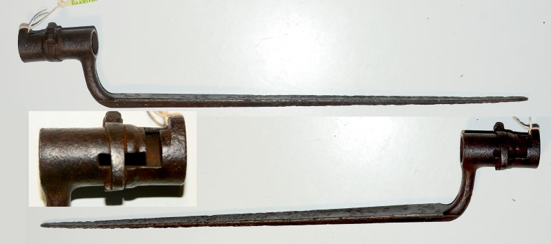 Tüllenbajonett mit ca. 38cm Klinge, Gesamtlänge 46,3 cm, Innendurchmesser der Tülle 22mm, mehrere erkennbare Stempel, "N:16", "A", und eine Marke, rostig