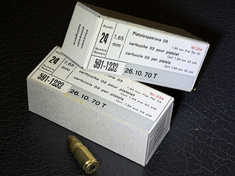 Biete zwei Packungen A24 Schuss, Schweizer Pistolenmunition 7,65mm Pistolenpatrone 03 von 26.10.1970 in Original Verpackung ungeöffnet siehe Fotos
