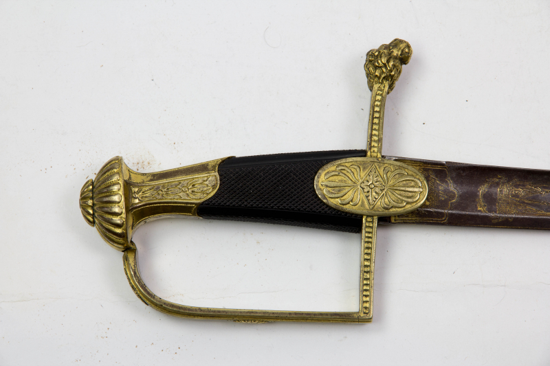 Säbel, Frankreich, Consulat, vor 1804, État-major, großes, vergoldetes Bügelgefäß, mit Ornamenten und Schuppenmuster verziert, griffeltes Ebenholzgriffstück, Löwenkopfabschluss, Rückenklinge mit Hohlschliff und Jelman, teilweise gebläut, mit Ornamenten, Sonne und reitenden Husaren verziert, Klinge gedunkelt, hochwertiger Säbel im Originalzustand, Gebrauchsspuren. L: 97 cm.