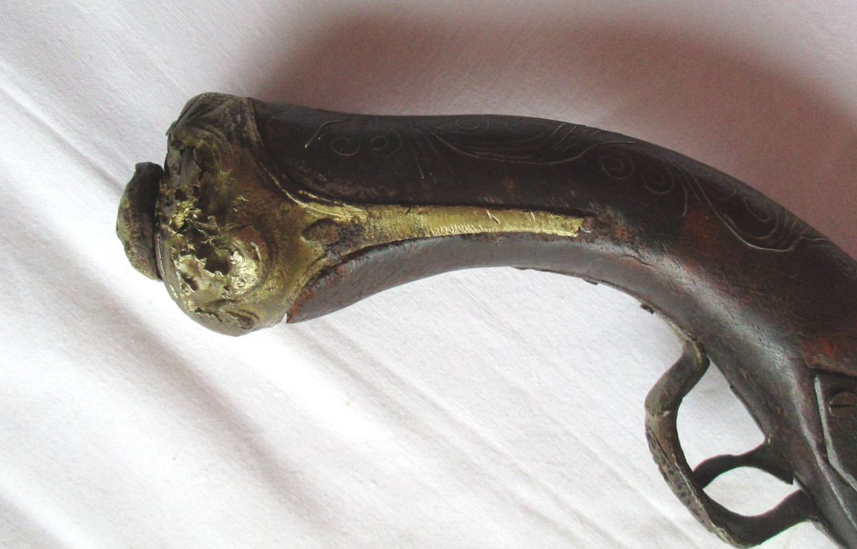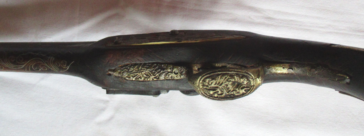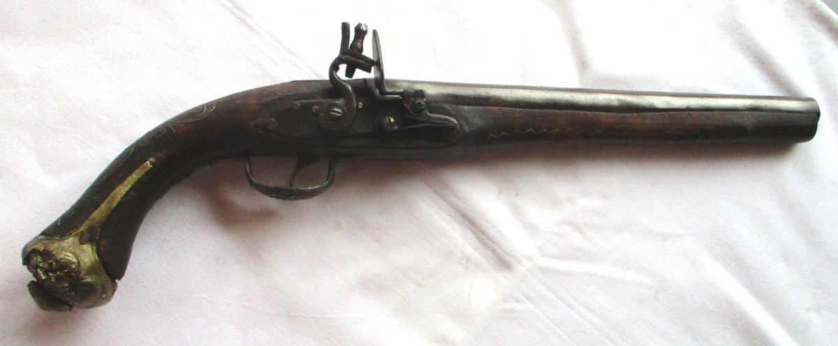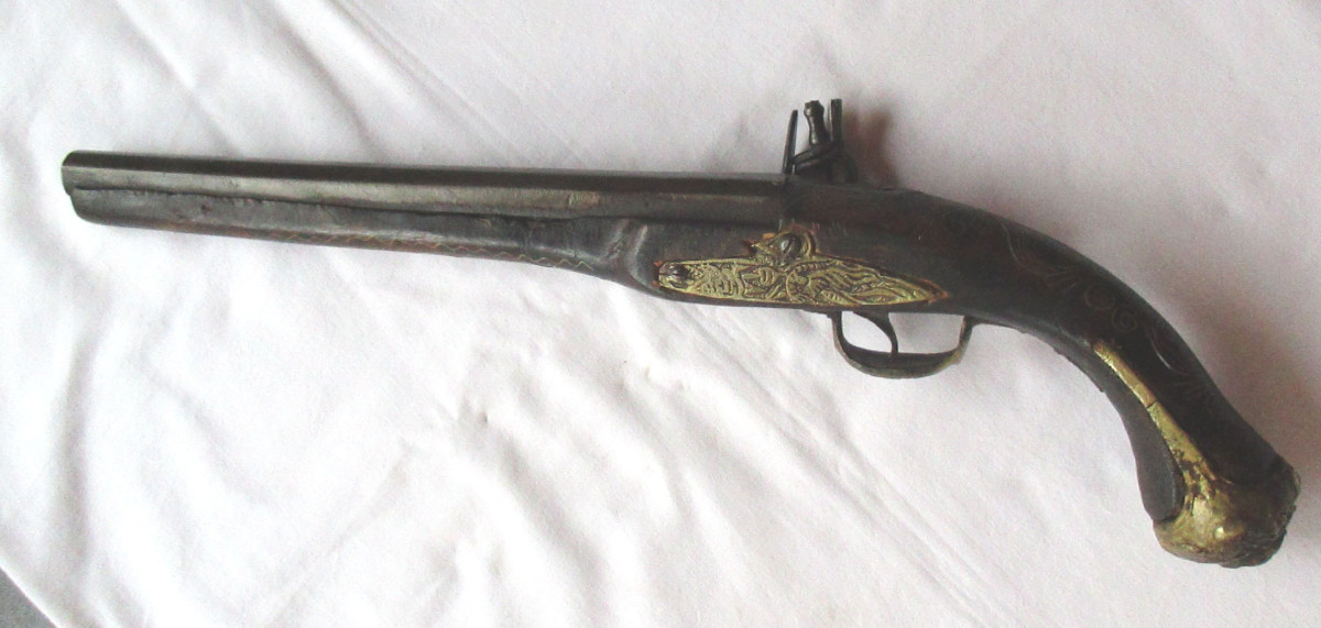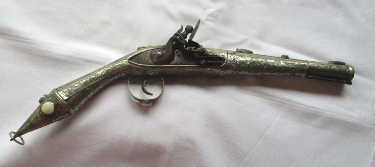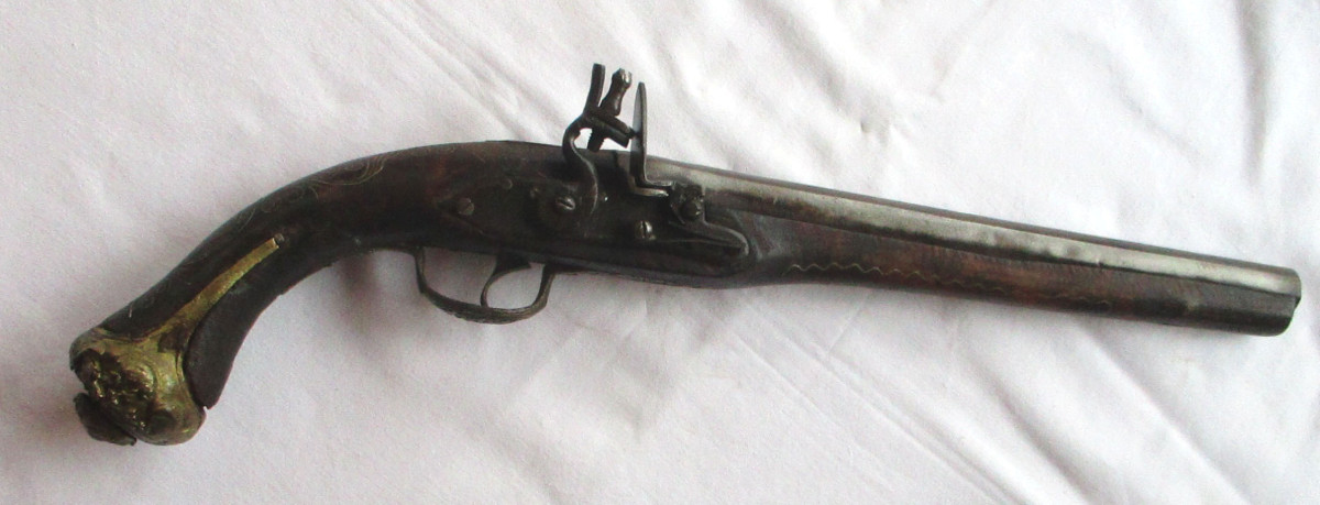 Vorderlader, Steinschloss - Pistole Steinschlosspistole, mit Messing.- oder Silberfaden Einlagen, und sonstigen Messing - Applikationen. Hahn lässt sich bewegen, rastet aber nicht ein. Schöne alte Deko – Waffe, aus Nachlass. Gesamtlänge ca. 50 cm. Frei ab 18. Jahren. Zustand siehe Foto.