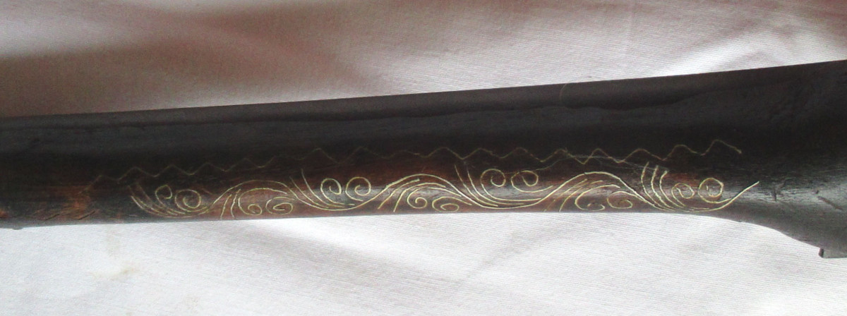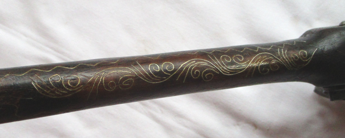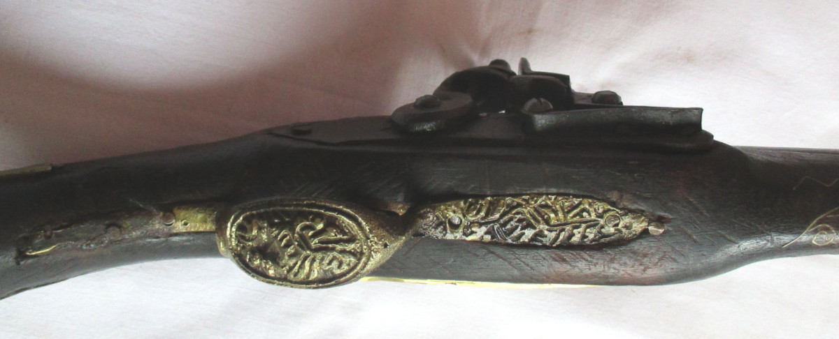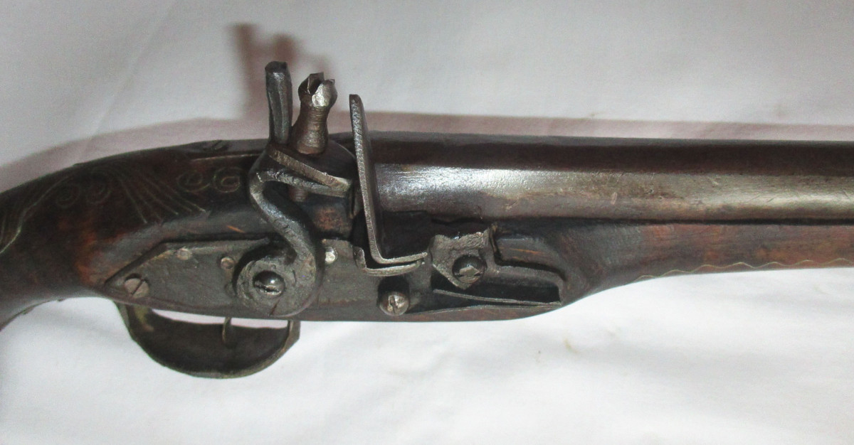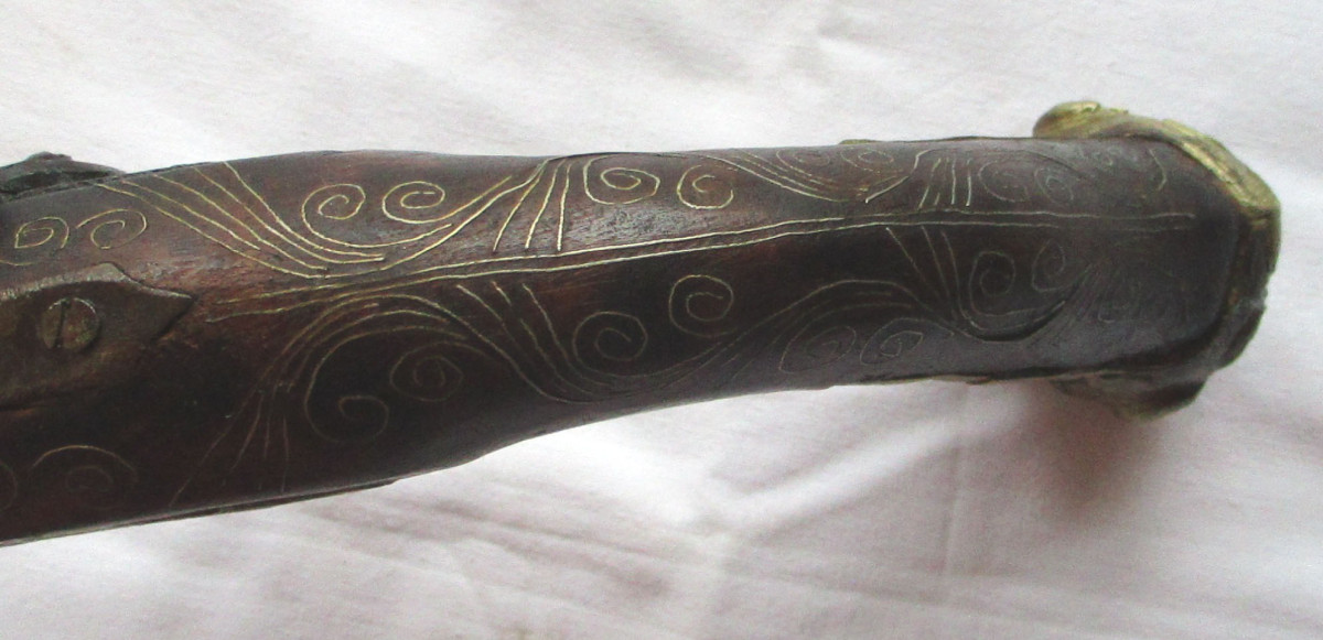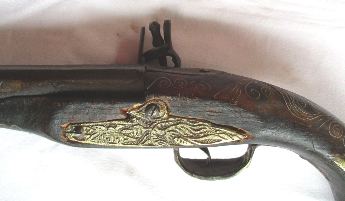 Vorderlader, Steinschloss - Pistole Steinschlosspistole, mit Messing.- oder Silberfaden Einlagen, und sonstigen Messing - Applikationen. Hahn lässt sich bewegen, rastet aber nicht ein. Schöne alte Deko – Waffe, aus Nachlass. Gesamtlänge ca. 50 cm. Frei ab 18. Jahren. Zustand siehe Foto.