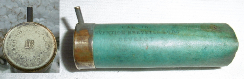 Angeboten wird 1 leere, ungebrauchte Lefaucheux-Schrothülse Kal. 16. Eine frühe Gevelot-Fertigung. Diese Hülse lagerte auf dem offenen Dachboden der Büchsenmacherei ERDELT in Neustadt/Haardt (Weinstraße). 100 Jahre haben eine Menge Schmutz hinterlassen, der noch nicht ganz entfernt ist.