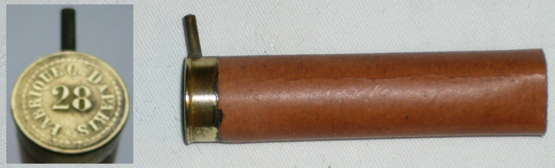 Angeboten wird 1 leere, ungebrauchte Lefaucheux-Schrothülse Kal. 28, FABRIQUE C & D PARIS, erhaben gestempelt.