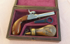 Kästchen mit Kunstleder bezogen, mit Pulverflasche, Laufschlüssel nach alter Art