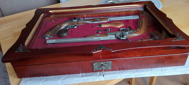 Weil der Höchstbieter die Zahlung veweigert, hier noch mal: Ich biete hier an, eine verglaste Schatulle mit 2 Duellpistolen mit Zubehör, Made in Spain. Die Pistolen sind uneingeschränkt schussfähig, mit gül. Beschuss. Die Läufe haben sg. Mikrozüge, und wurden bis jetzt nie geschossen. Beide Pistolen haben polierte, unbehandelte Oberfläche, vermutlich Edelstahl (ohne gewähr) beide haben fortlaufende Seriennummer. Die Schatulle(Vitrine) hat an der Unterseite 2 Aufhänge-Ösen. Ich habe keine Schäden, Rost, Risse, gefunden, alles ist in Topzustand. Ein super schönes Geschenk zum Weihnachten! Hier ab 1 € Abholung bevorzugt, sonst Versand mit DHL versichert bis 2500€ Bitte Altersnachweis nicht vergessen, wenn Sie kein ID Egun-er seid.
