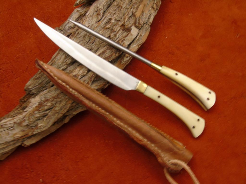 Hier erhalten Sie ein ansprechendes Hand geschmiedetes Mittelalter Messer mit Esspfriem aus Carbon Stahl. Griff aus Knochen Die ebenfalls Hand gefertigte Leder Scheide besteht aus hochwertigem Rind Leder.