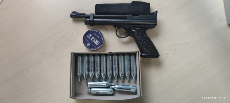 Hallo, verkaufe hier eine Crosman 2240 CO2 Pistole. Die Waffe funktioniert einwandfrei hat allerdings kleine Gebrauchsspuren.