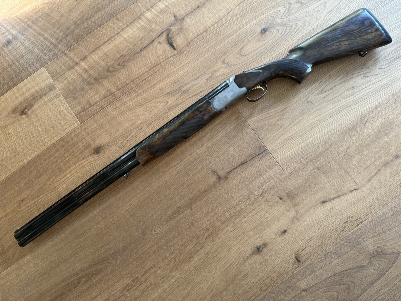 Bockflinte Fabarm Gamma 2 Field Kal. 12/76. Lauflänge 71 cm, Multichoke-Einsätze halb und voll, Keine weiteren Einsätze und kein passendes Werkzeug zum Wechseln der Chokes. Stahlbeschuss, Stahlbasküle, verstellbarer Einabzug, Ejektor, ventilierte Schiene, Gewicht ca. 3,6 kg, Schaflänge ca. 36 bis 37,5 cm, Brünierung und Schiene durch Flugrost oberflächlich angegriffen (siehe Foto). Tenisch ist die Waffe einwandfrei, der Verschluss ist auch ohne Vorderschaft ohne jedes Spiel. Besichtigung südlich von München möglich und auch erwünscht.