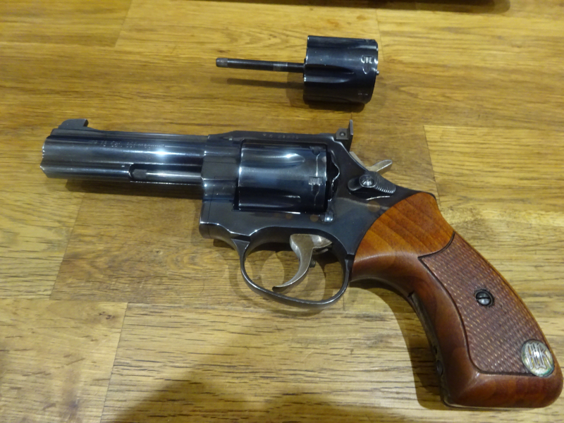 Die Waffe ist wenig geschossen worden, Lauf und Patronenkammern sind blank, auch bei der Wechseltrommel.
