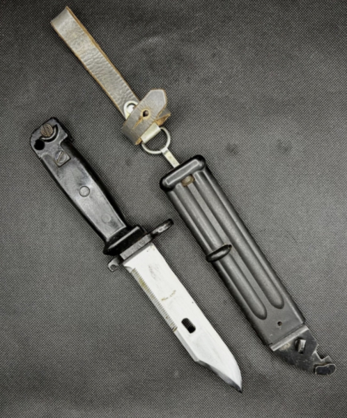 NVA Mehrzweckbajonett AK74 Klinge geschärft, Nummerngleich Griff und Scheide.