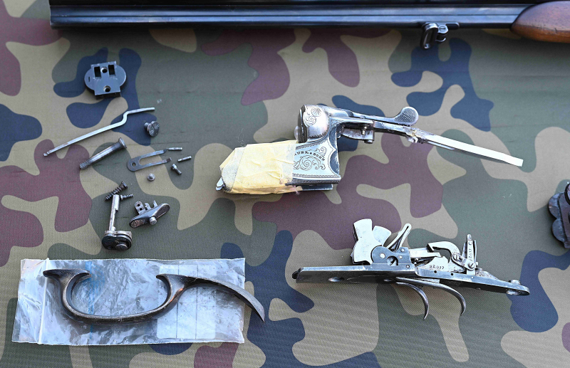 Gleich unterhalb des Schwenkriegels/Öffnungshebels ist der Leichtmetallsteg durchgebrochen und einmal dilettantisch geschweißt worden. Die gesamte Öffnungsmechanik und auch die ausgebaute, teilzerlegte Abzugsgruppe sieht vom Zustand her noch sehr gut aus.