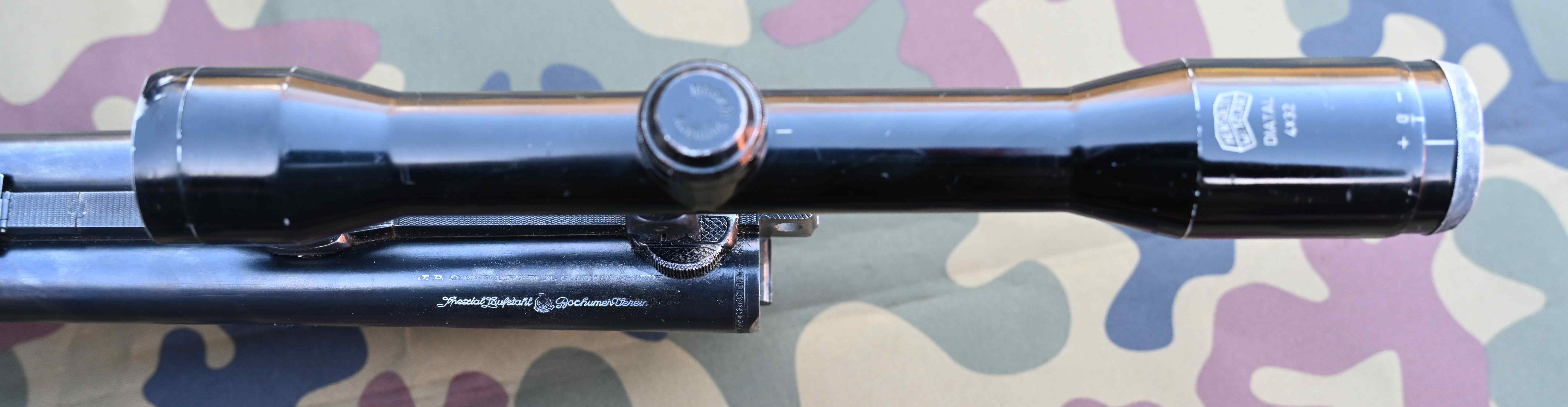 Das Zielfernrohr HENSOLDT DIATAL 4x32 mit Absehen 1 ist innen hell uind tadellos, äßerlich aber mit Gebrauchsspuren und leichter Delle vorn. Suhler Einhakmontage.