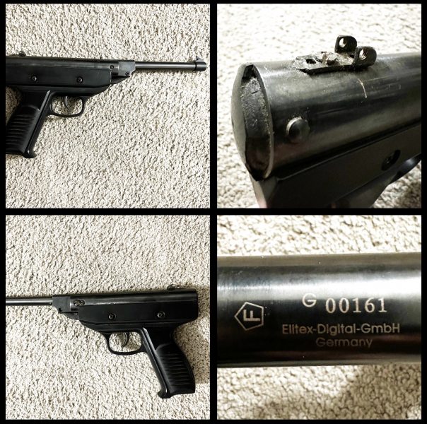 Luftpistole 4,5mm, Visier hinten fehlt, Endkappe mit Abplatzer. Druck und Mechanik in Ordnung.