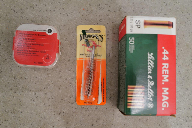 46 Patronen (TM) SB .44 Magnum und neues Reinigungszeug (Bronzebürste und Reinigungspropfen).